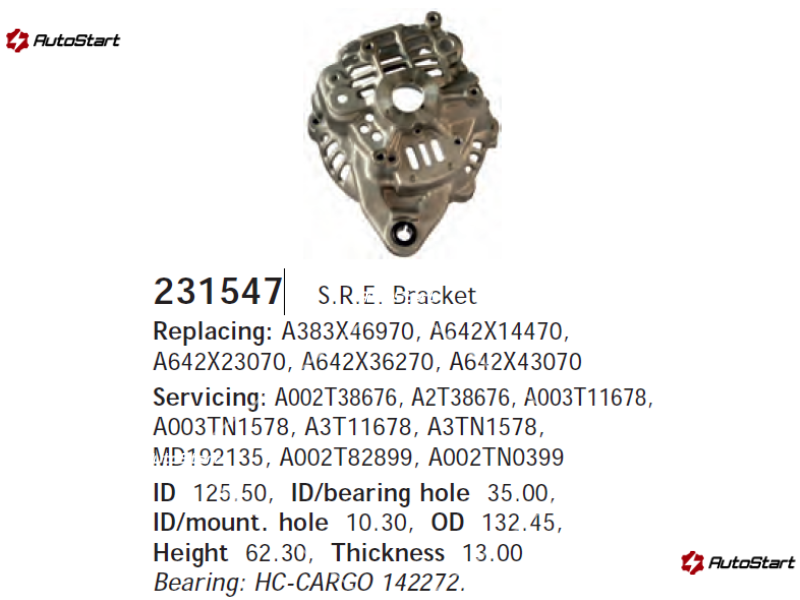 Діаметр під підшипник (CARGO 142272) - 35.00 мм, висота проточки під підшипник - 13.00 мм, діаметр монтажного отвору - 10.40 мм