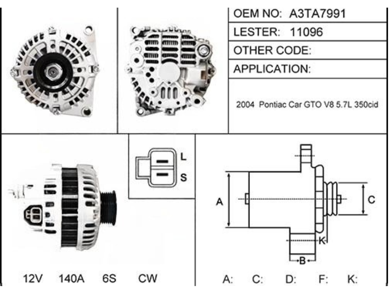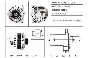 11096 LESTER: OEM: A3TA7991 DESCRIPTION: 140A 12V CW IR/IF 6S APPLICATLON: PONTIAC: TO 2004 V8 5. 7L